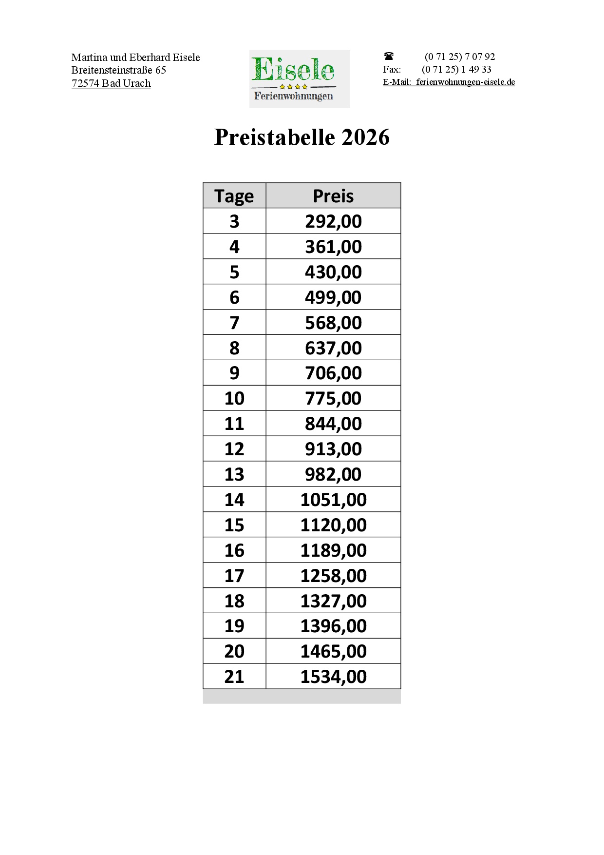 Die in der Preistabelle ausgewiesenen Preise gelten nur bei direkter Buchung bei Ferienwohnungen Eisele – per Telefon oder E-Mail –